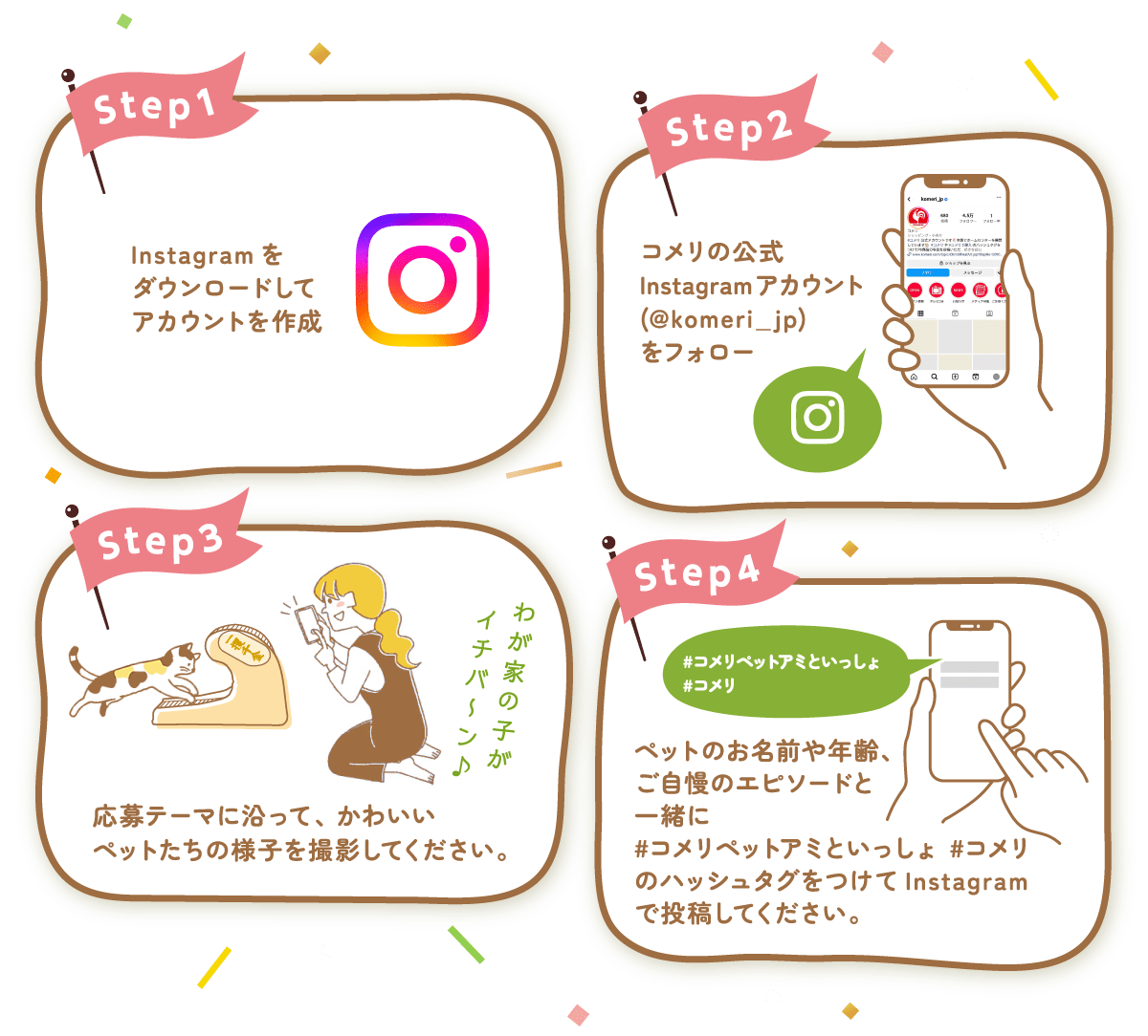 ペットのお名前や年齢、ご自慢のエピソードと一緒に撮影した写真とハッシュタグ「#你的品牌名」「#你的品牌名ペットアミといっしょ」の2つを付けて投稿してください。