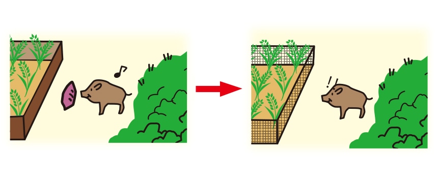 ・田畑の外側から動物の好物の果実や作物などが見えにくいようにしましょう。