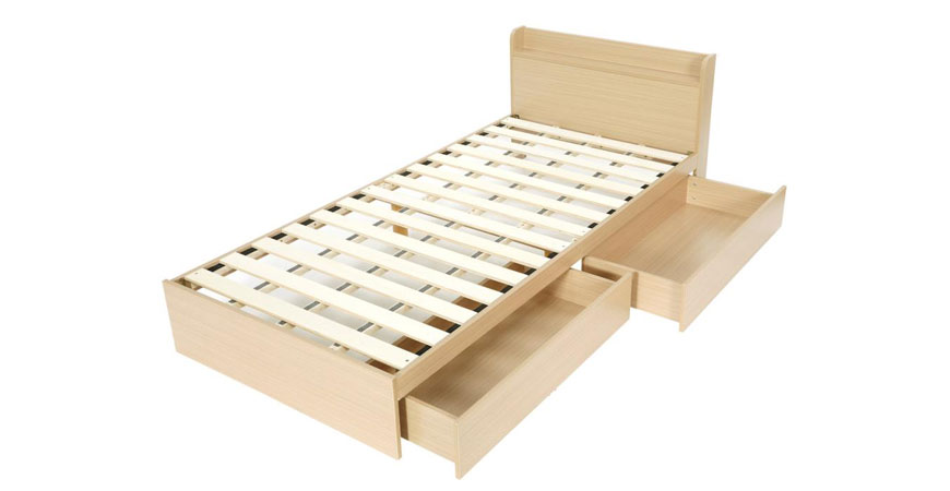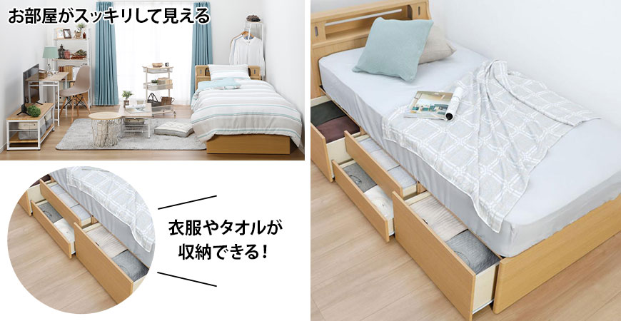 ■たっぷり収納できる引き出し2杯付き。引き出しはベッドの左右どちらにでも設置できます。