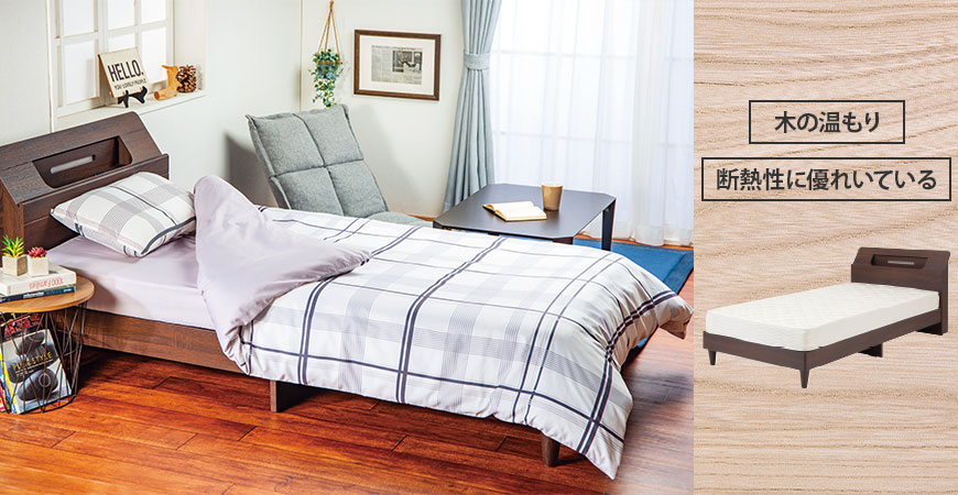 木製ベッドはシンプルで落ち着きのあるベッドです。木のぬくもりを感じられ、ナチュラルで落ち着いた空間を演出します。また木製ベッドはお部屋にも合わせやすいのが特徴です。