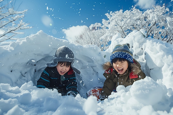 雪を積み上げて作る秘密基地です。中に入って暖をとったり、おやつを食べたり、特別な空間で過ごすのも良いでしょう。 雪上アスレチックを作るのもおすすめです。雪を使って滑り台やトンネル、橋などを作れば、子供たちは大喜びすること間違いなし。創造力を働かせて、オリジナルのアスレチックを作ってみましょう。