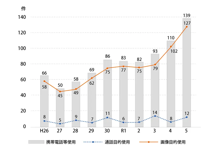自転車(第1当事者)の運転者が携帯電話等使用の状態であった場合の交通事故件数の推移
