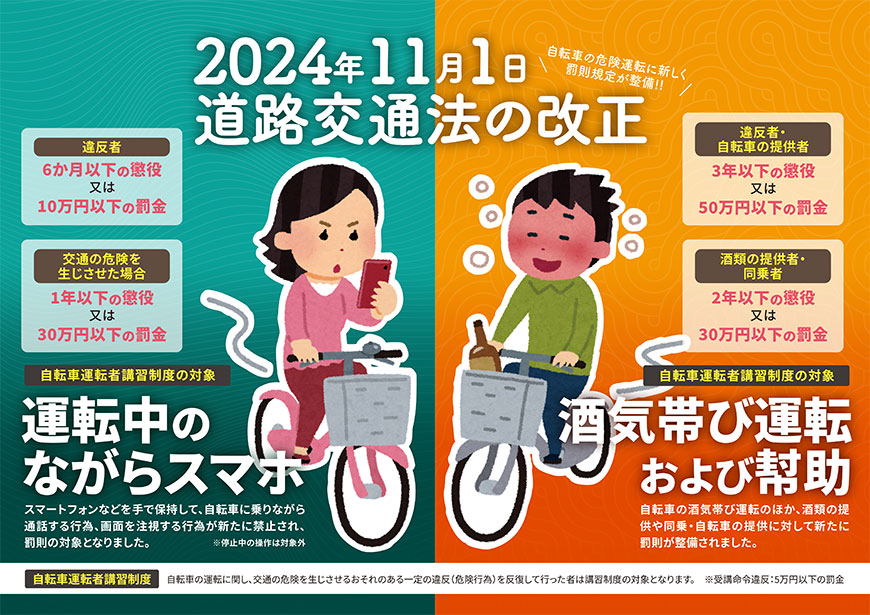 2024年11月1日より、自転車の運転中の携帯電話使用(いわゆる「ながらスマホ」)や酒気帯び運転が厳罰化されます。自転車に乗る際は、これらのルールをしっかりと守り、安全なサイクリングを心掛けましょう。