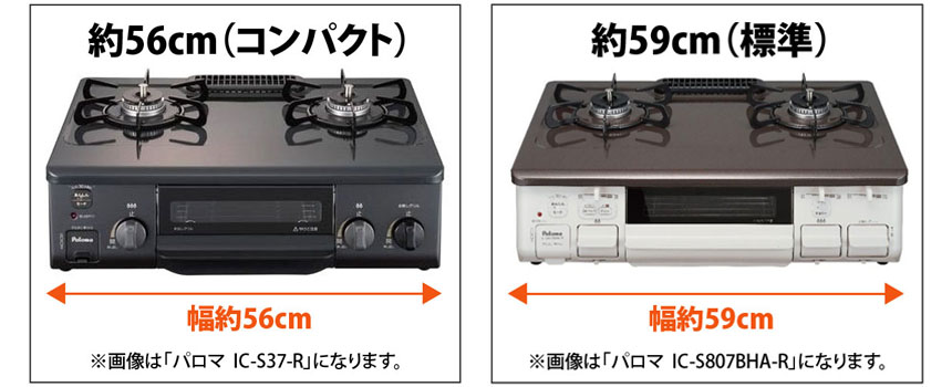 ガステーブルの横幅には大きく分けて約56㎝幅の『コンパクトタイプ』と約59㎝幅の『標準タイプ』があります。ご自宅の設置スペースのサイズを測り、確認するようにしましょう。