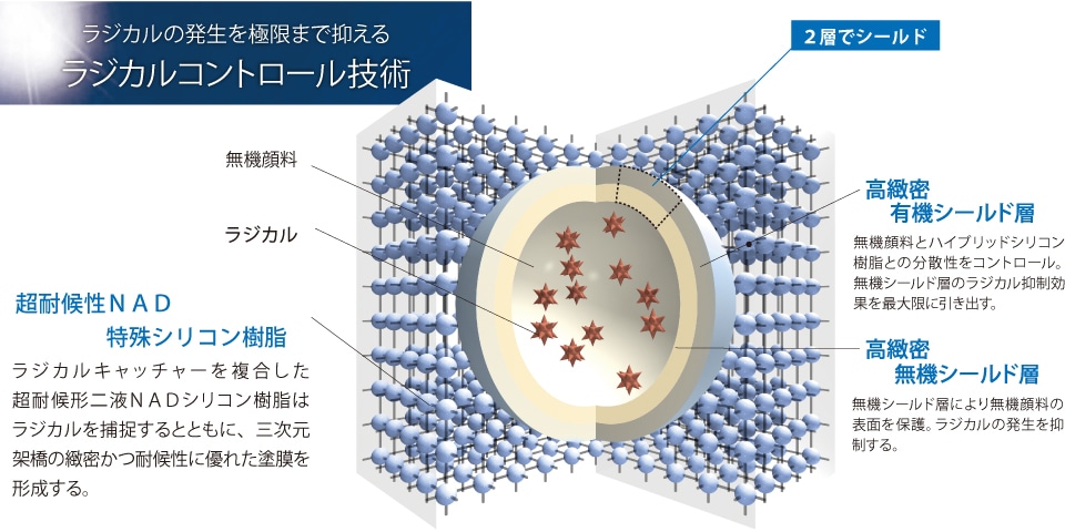 エスケープレミアムルーフSiは無機顔料の表面を高緻密ダブルシールド層でガードすることにより、ラジカルの発生を抑制します。また、超耐候性NADシリコン樹脂により、三次元架橋の緻密な塗膜を形成するとともに、わずかに発生したラジカルもラジカルキャッチャーが捕捉します。