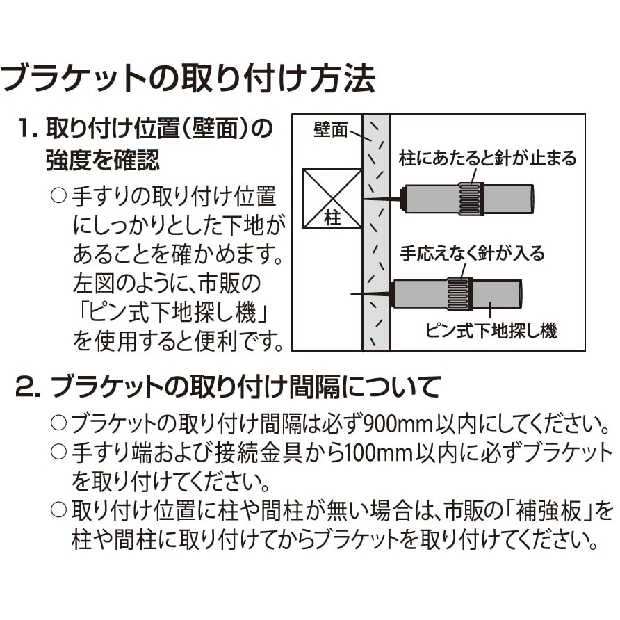 ●取り付け位置(壁面)の強度の確認をしてください。市販の「ピン式下地探し機」等を使って取り付け位置にしっかりとした下地(柱や間柱)があることを確かめてください。