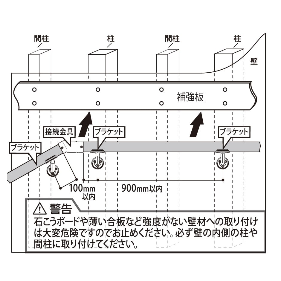 ●石こうボードや薄い合板など強度がない壁材への取り付けは大変危険ですのでお止めください。必ず壁の内側の柱や間柱に取り付けてください。