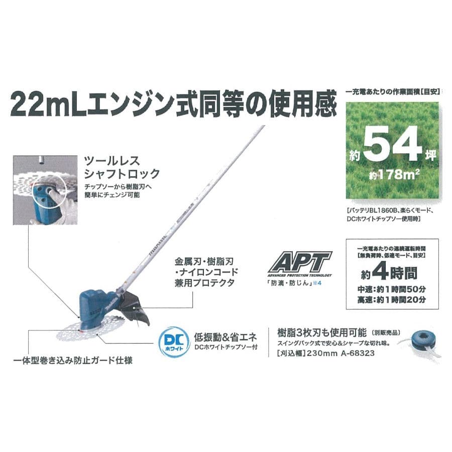 ・防じん 防滴 アプト搭載。キックバック時に刃物がストップ、AFT搭載。ソフトブレーキ付。カラミトリ逆回転機能付。Uハンドルで、家周りから平坦地の草刈りに。分割式棹で軽自動車のトランクに積み込み可能。