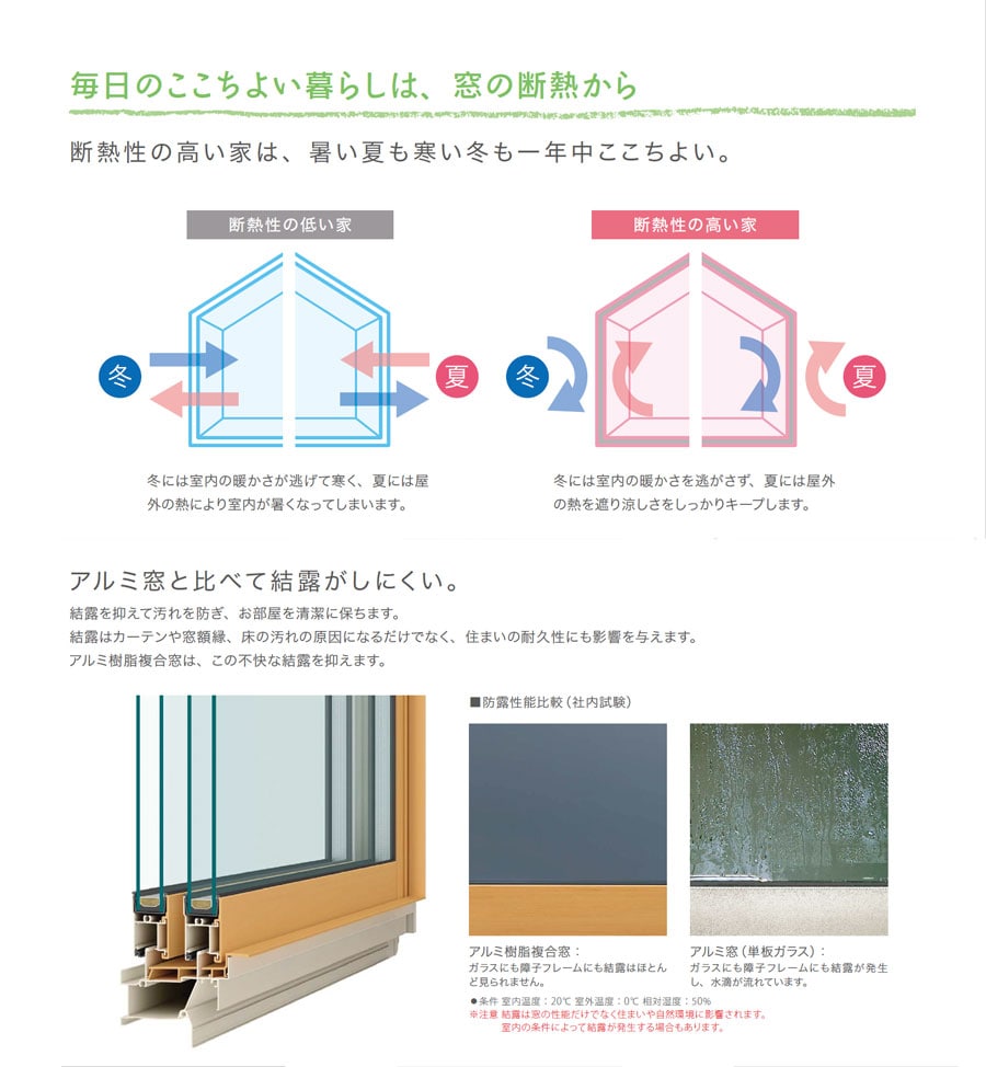 ●アルミ樹脂複合窓なのでアルミ窓より結露がしにくくガラスも二重なので、冬には室内の暖かさを逃がさず、夏は屋外の熱を遮ります。