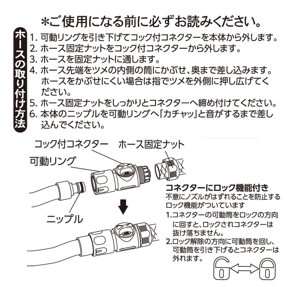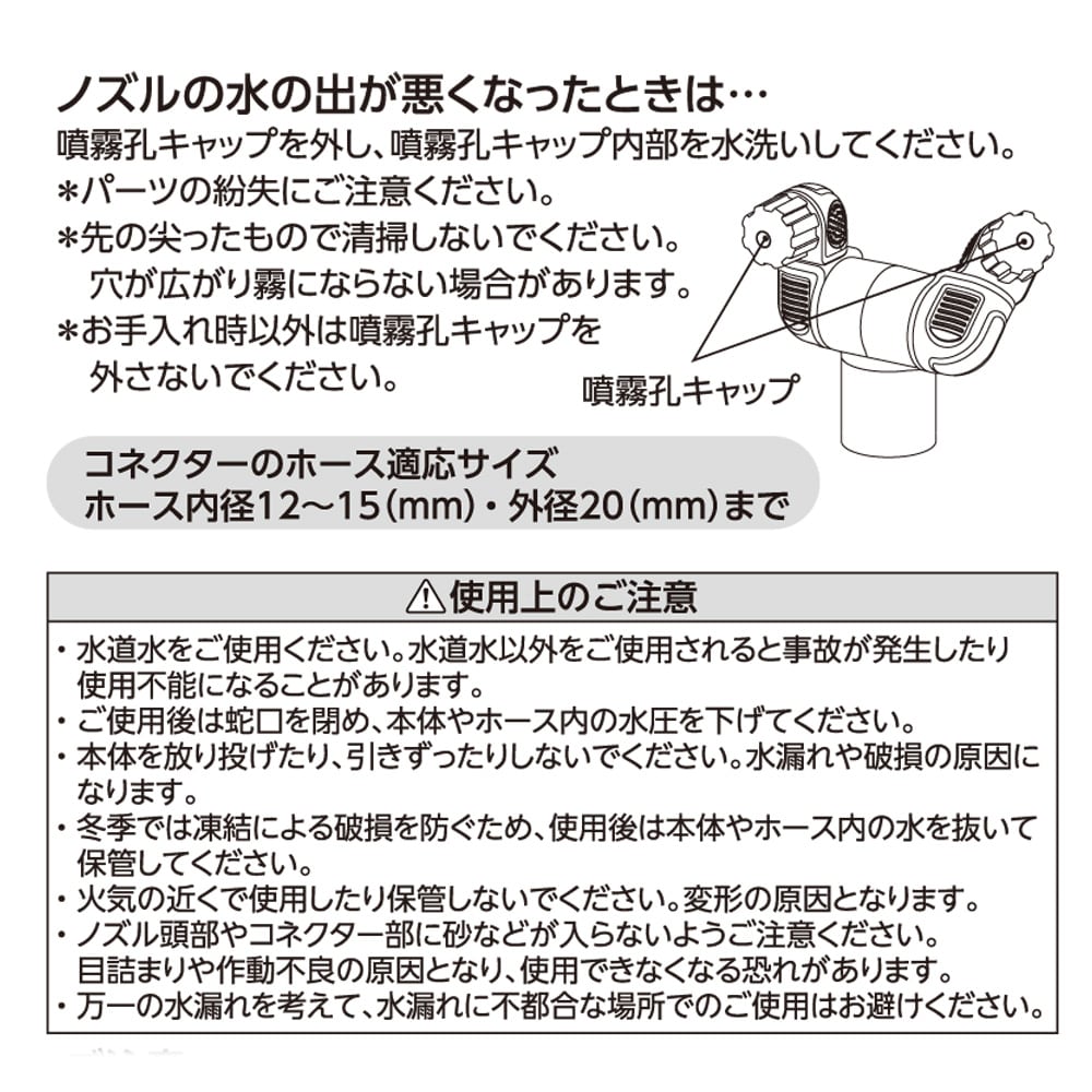 【使用上のご注意】 ・水道水をご使用ください。水道水以外をご使用されると事故が発生したり使用不能になることがあります。 ・ご使用後は乾口を閉め、本体やホース内の水圧を下げてください。 ・本体を放り投げたり、引きずったりしないでください。水濡れや破損の原因になります。 ・冬季では凍結による破損を防ぐため、使用後は本体やホース内の水を抜いて保管してください。 ・火気の近くで使用したり保管しないでください。変形の原因となります。 ・ノズル頭部やコネクター部に砂などが入らないようご注意ください。 目詰まりや作動不良の原因となり、使用できなくなる理れがあります。 ・万一の水漏れを考えて、水漏れに不都合な場所でのご使用はお避けください。 ・洗濯物など濡れて困るようなものの近くでは使用しないでください。 ・水道水をご使用ください。