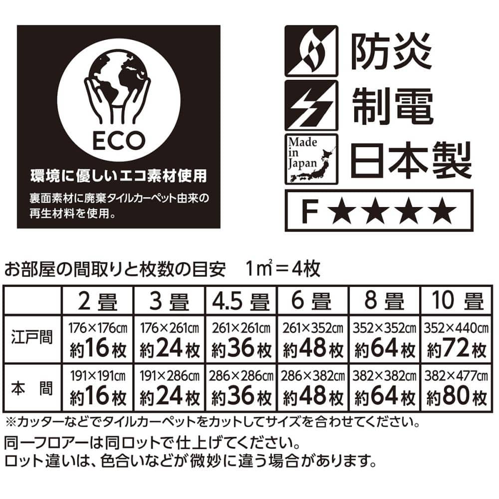 ●安心の防炎加工 ●制電加工されているのでオフィスでも安心してお使いいただけます ●汚れたとこだけ取り替え可能なので経済的です ●日本製です ●環境に優しいエコ素材使用(裏面素材にタイルカーペット由来の再生材料) 同一フロアーは同ロットで仕上げてください。 ロット違いは、色合いなどが微妙に違う場合があります。
