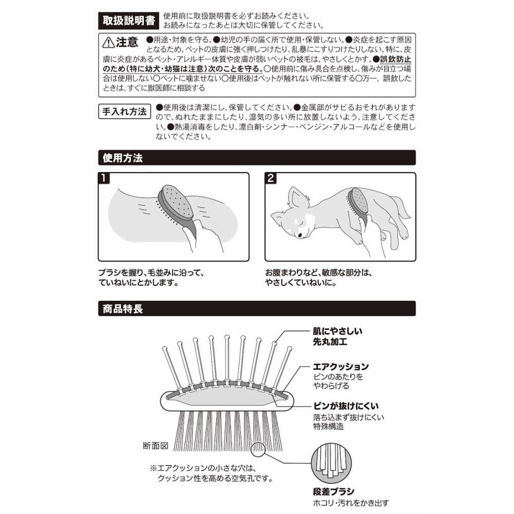 ●炎症を起こす原因となるため、ペットの皮膚に強く押しつけたり、乱暴にこすりつけたりしない。特に、皮膚に炎症があるペット・アレルギー体質や皮膚が弱いペットの被毛は、やさしくとかす。