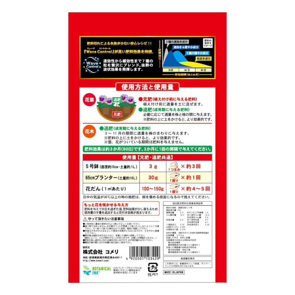 ●肥料効果が3ケ月と長く、元肥・追肥の両方に使えます。 ●7種の粒が次々に効く「ウェーブコントロール」を採用し、肥料切れによる失敗を軽減します。 ●「フミン酸」の働きにより土壌を改良して、土をふかふかにします。 ●8種ミネラル」を含有し、丈夫な株を育てます。