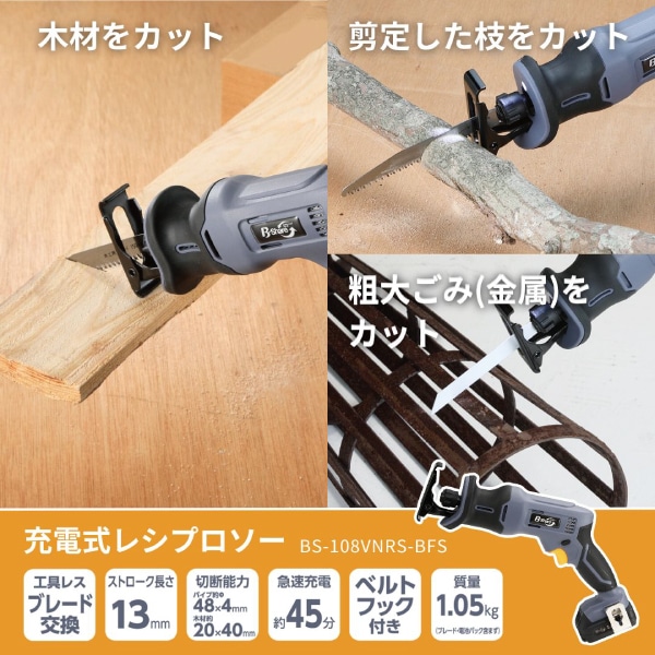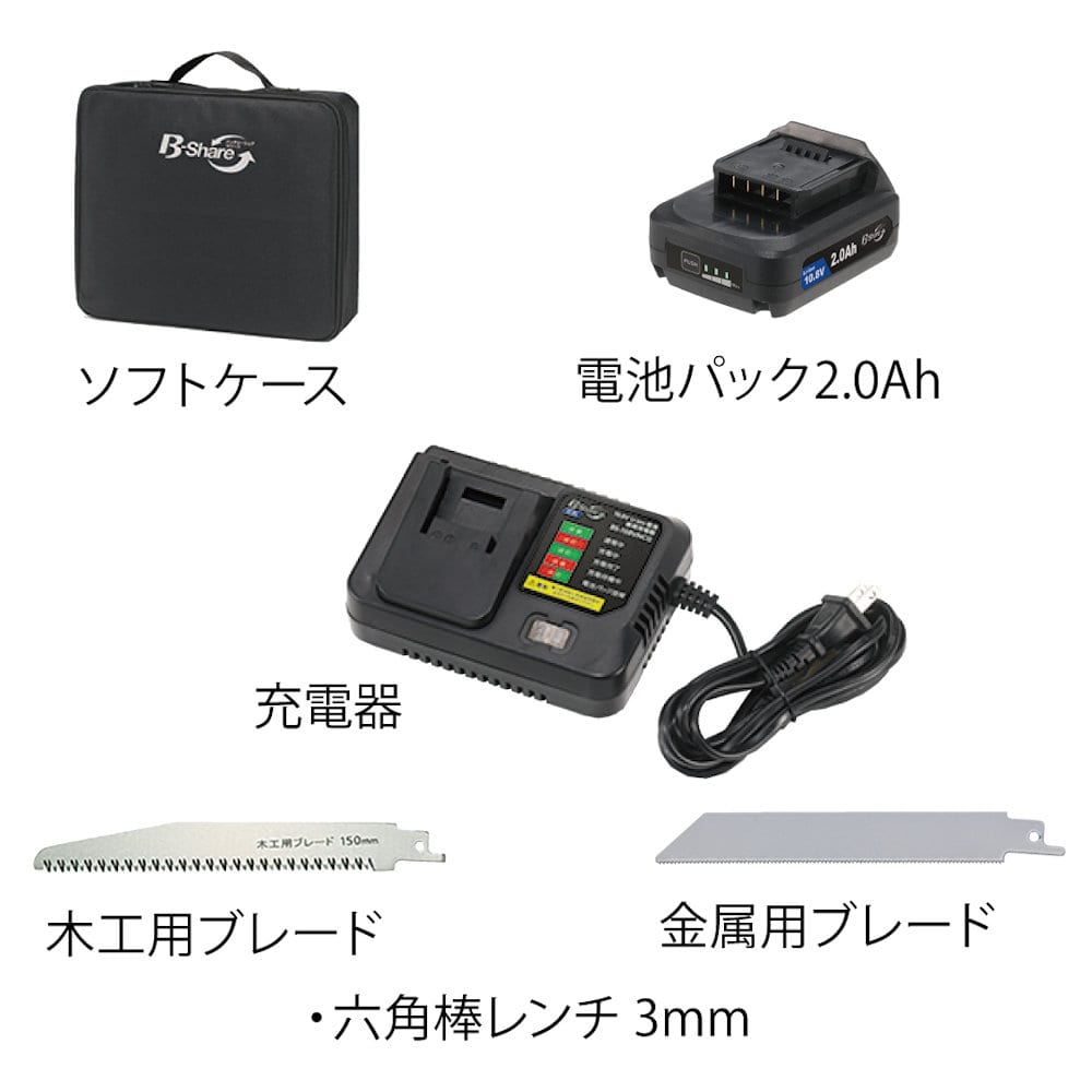 ●10.8Vバッテリーのシェアシリーズの電動工具 ●木様々な素材をスピード切断 ●バッテリー・充電器・木工用ブレード・金属用ブレード・六角棒レンチ3㎜・ソフトケース付き ●ベルトフック付き
