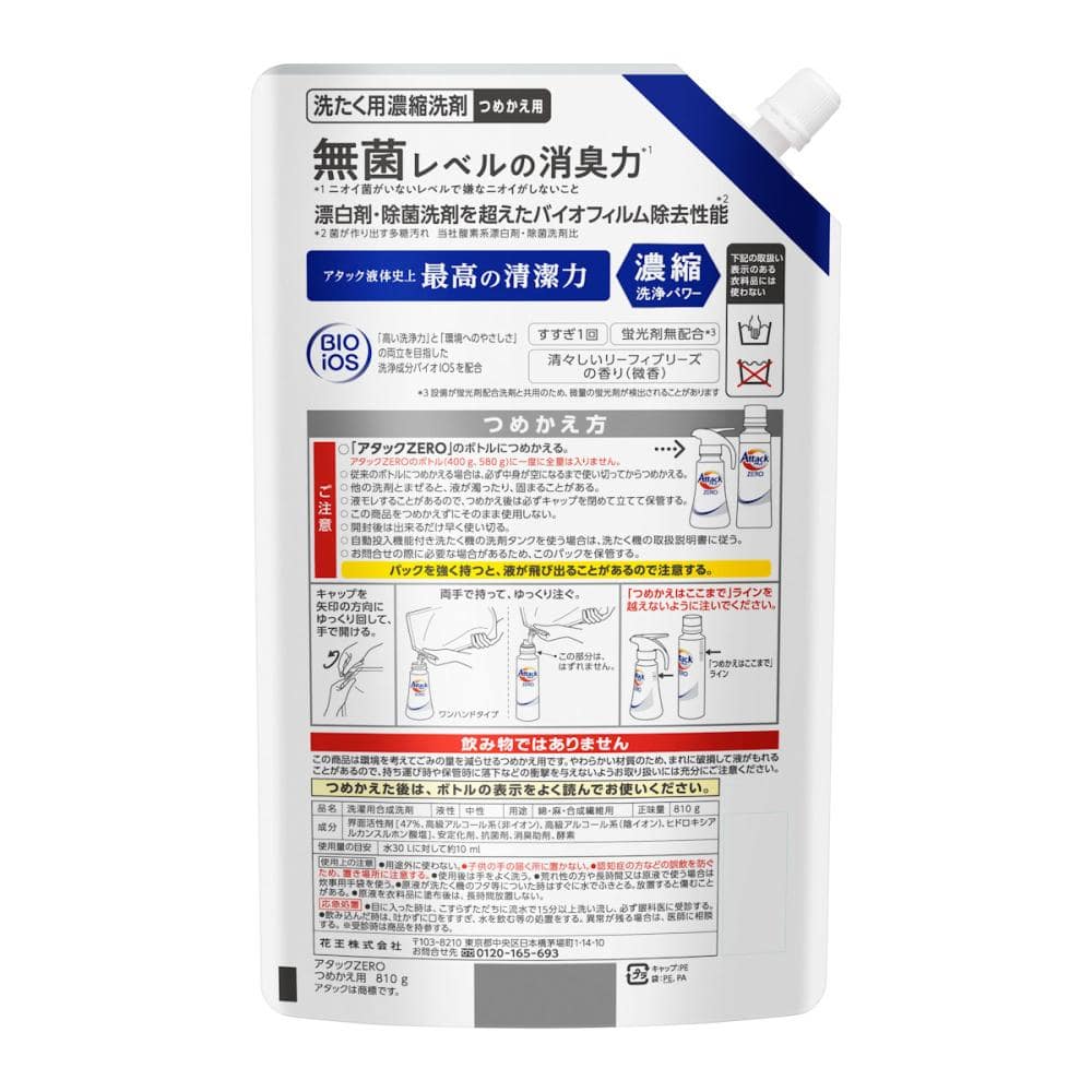 使用上の注意:つめかえ方 ご注意 ○「アタックZERO」のボトルにつめかえる。アタックZEROのボトル(400 g、580 g)に一度に全量は入りません。 ○ 従来のボトルにつめかえる場合は、必ず中身が空になるまで使い切ってからつめかえる。 ○ 他の洗剤とまぜると、液が濁ったり、固まることがある。 ○ 液モレすることがあるので、つめかえ後は必ずキャップを閉めて立てて保管する。 ○ この商品をつめかえずにそのまま使用しない。 ○ 開封後は出来るだけ早く使い切る。 ○ 自動投入機能付き洗たく機の洗剤タンクを使う場合は、洗たく機の取扱説明書に従う。 ○ お問合せの際に必要な場合があるため、このパックを保管する。 パックを強く持つと、液が飛び出ることがあるので注意する。 使用上の注意 ●用途外に使わない。 ●子供の手の届く所に置かない。 ●認知症の方などの誤飲を防ぐため、置き場所に注意する。 ●使用後は手をよく洗う。 ●荒れ性の方や長時間又は原液で使う場合は炊事用手袋を使う。 ●原液が洗たく機のフタ等についた時はすぐに水でふきとる。放置すると傷むことがある。 ●原液を衣料品に塗布後は、長時間放置しない。