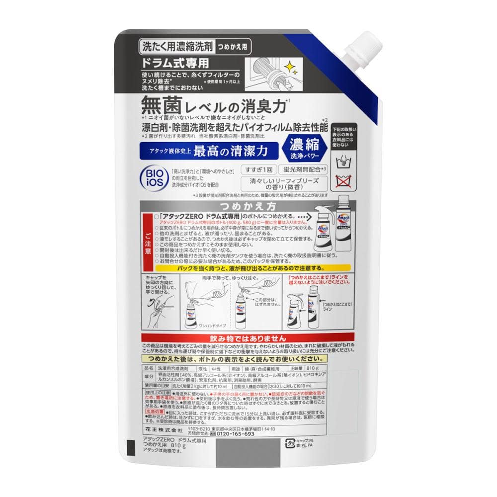 使用上の注意:つめかえ方 ご注意 ○「アタックZERO ドラム式専用」のボトルにつめかえる。アタックZERO ドラム式専用のボトル(400 g、580 g)に一度に全量は入りません。 ○ 従来のボトルにつめかえる場合は、必ず中身が空になるまで使い切ってからつめかえる。 ○ 他の洗剤とまぜると、液が濁ったり、固まることがある。 ○ 液モレすることがあるので、つめかえ後は必ずキャップを閉めて立てて保管する。 ○ この商品をつめかえずにそのまま使用しない。 ○ 開封後は出来るだけ早く使い切る。 ○ 自動投入機能付き洗たく機の洗剤タンクを使う場合は、洗たく機の取扱説明書に従う。 ○ お問合せの際に必要な場合があるため、このパックを保管する。 パックを強く持つと、液が飛び出ることがあるので注意する。 使用上の注意 ●用途外に使わない。 ●子供の手の届く所に置かない。 ●認知症の方などの誤飲を防ぐため、置き場所に注意する。 ●使用後は手をよく洗う。 ●荒れ性の方や長時間又は原液で使う場合は炊事用手袋を使う。 ●原液が洗たく機のフタ等についた時はすぐに水でふきとる。放置すると傷むことがある。 ●原液を衣料品に塗布後は、長時間放置し