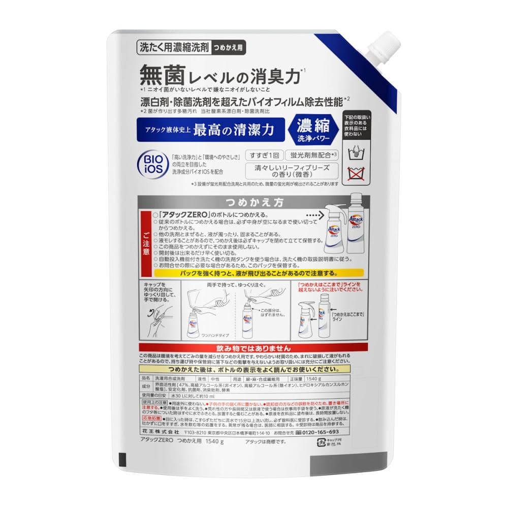 使用上の注意:つめかえ方 ご注意 ○「アタックZERO」のボトルにつめかえる。 ○ 従来のボトルにつめかえる場合は、必ず中身が空になるまで使い切ってからつめかえる。 ○ 他の洗剤とまぜると、液が濁ったり、固まることがある。 ○ 液モレすることがあるので、つめかえ後は必ずキャップを閉めて立てて保管する。 ○ この商品をつめかえずにそのまま使用しない。 ○ 開封後は出来るだけ早く使い切る。 ○ 自動投入機能付き洗たく機の洗剤タンクを使う場合は、洗たく機の取扱説明書に従う。 ○ お問合せの際に必要な場合があるため、このパックを保管する。 パックを強く持つと、液が飛び出ることがあるので注意する。 使用上の注意 ●用途外に使わない。 ●子供の手の届く所に置かない。 ●認知症の方などの誤飲を防ぐため、置き場所に注意する。 ●使用後は手をよく洗う。 ●荒れ性の方や長時間又は原液で使う場合は炊事用手袋を使う。 ●原液が洗たく機のフタ等についた時はすぐに水でふきとる。放置すると傷むことがある。 ●原液を衣料品に塗布後は、長時間放置しない。