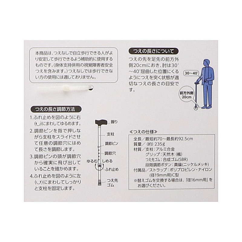 本商品は、杖なしで自立歩行できる人がより安定して歩行できるよう補助的に使用するものです(身体支持併用の視覚障者安全杖を含みます)。