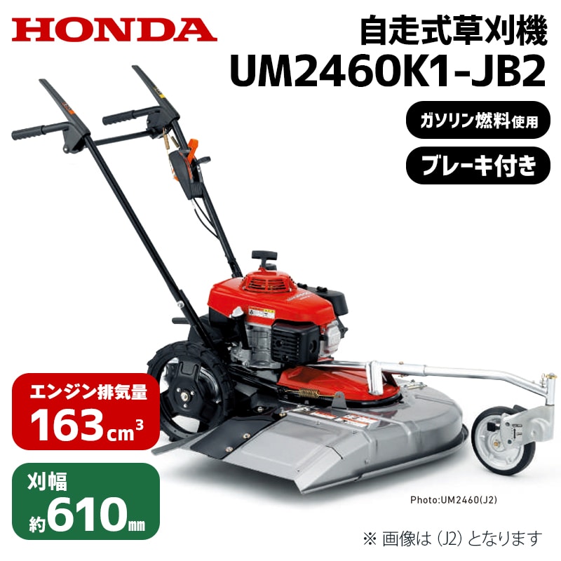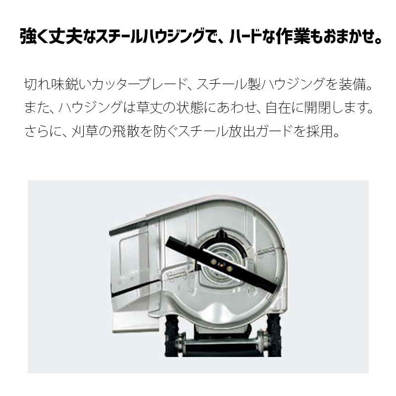 傾斜地での作業性を高めるブレーキ付。 【性能】 ●エンジン形式:4サイクル ●排気量:163cc ●燃料:無鉛レギュラーガソリン ●エンジンオイル(推奨):4サイクルエンジンオイル Honda純正ウルトラU汎用(SAE10W-30) またはAPI分類SE級以上のSAE10W-30 ●オイル容量:0.65L ●燃料タンク:1.6L ●点火プラグ:BPR5ES(NGK)、W16EPR-U(DENSO) ●刈幅:610mm ●刈り取り高さ:15、30、50、75mm(4段階) ●変速段数:無段変速 ●車速:0.4-1.0m/秒
