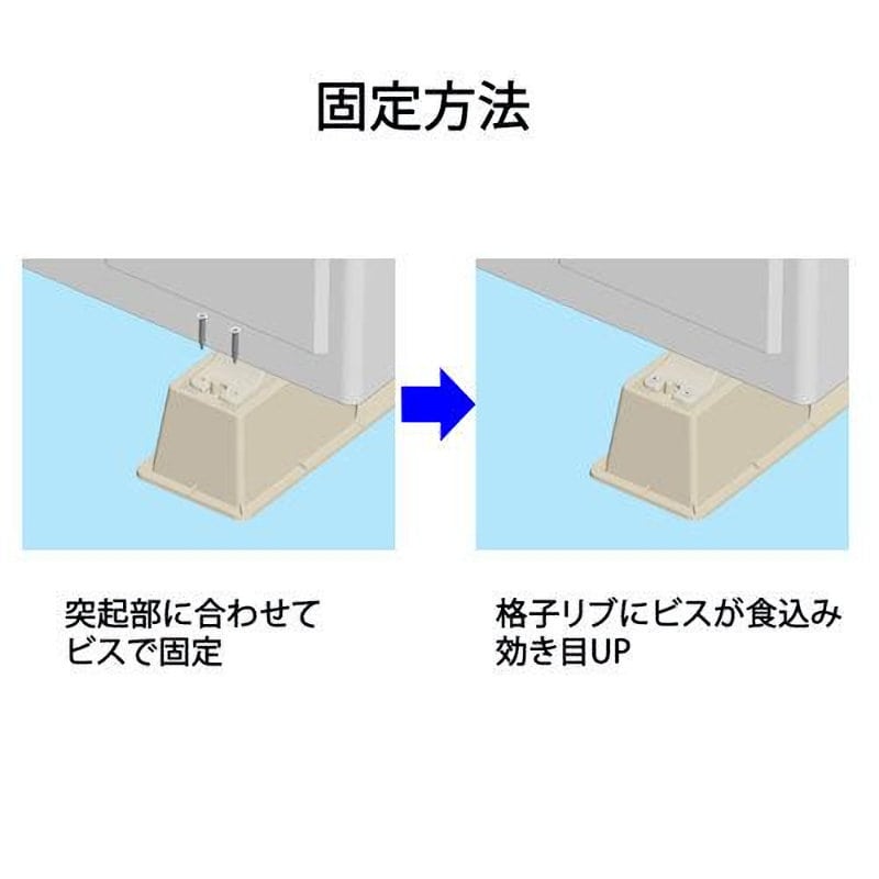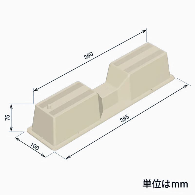 ●天面はゆったり360mm、底面は395mmとコンパクト、狭い現場でも使いやすい ●ポリプロピレン樹脂製の軽量タイプ ●積み重ねができ、省スペース ●突起合わせでカンタン位置決め ●ブラスト加工でビスがスベリ難い ●底面滑り止め加工で機器の振動によるズレを防止(状況により防振ゴムや底板をご使用ください) ●耐薬品性・耐候性に優れ、汚れにくい ●各メーカーの大型ルームエアコン室外機に対応(質量80Kg以下、1台2個使用時) ●1本の寸法:幅395×奥行100×高さ75mm ●カラー:アイボリー