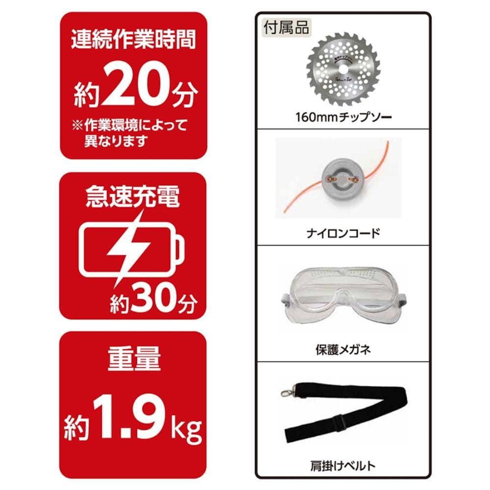 【付属品の名称】160mmチップソー、肩掛けベルト、補助ハンドル、固定ガイド、固定ネジ、L型棒レンチ、ボックスレンチ、キワ刈りガード、安全カバー、ナイロンコード、保護メガネ