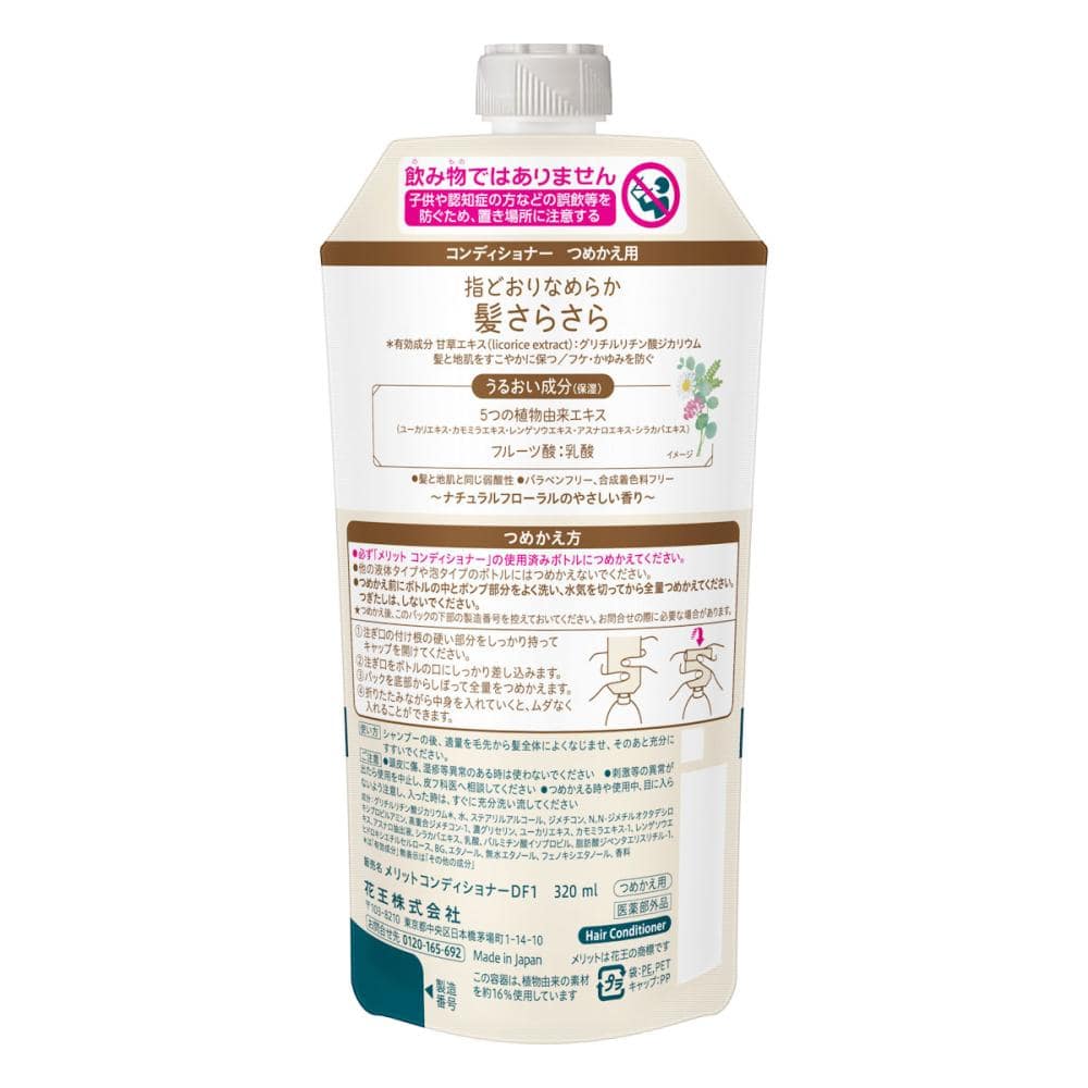 指どおりなめらか、髪さらさら。 ●うるおい成分:5つの植物由来エキス(ユーカリ・カモミラ・レンゲソウ・アスナロ・シラカバ)、フルーツ酸(乳酸)配合 ●髪と地肌と同じ弱酸性 ●パラベンフリー・合成着色料フリー ●有効成分 甘草エキス(グリチルリチン酸ジカリウム) ●髪と地肌をすこやかに保つ ●フケ・かゆみを防ぐ (医薬部外品)