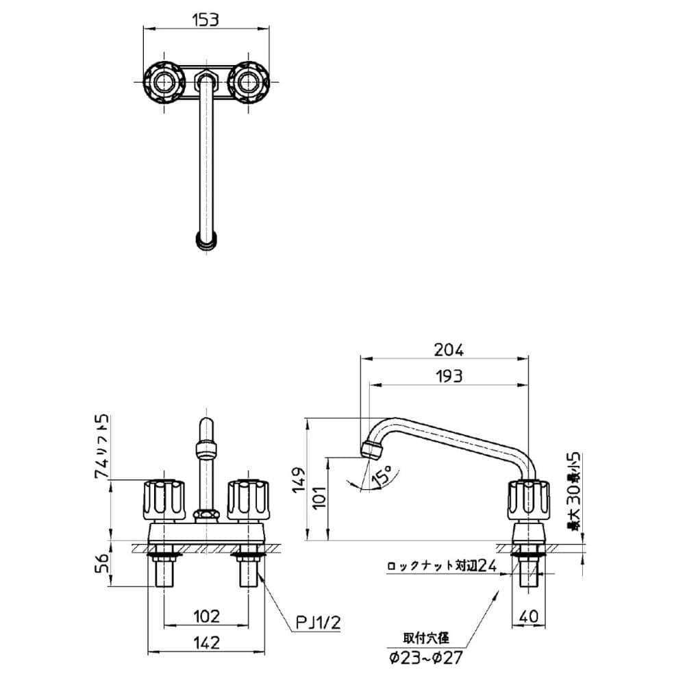 呼び13 ネジサイズ:PJ1/2 取付ピッチ:102mm ロックナット対辺:24mm 取付穴径:23~27mm パイプの長さ:193mm