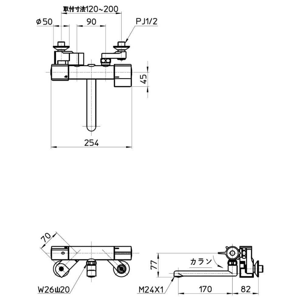 パイプの長さは170mmです。取付寸法:120~200