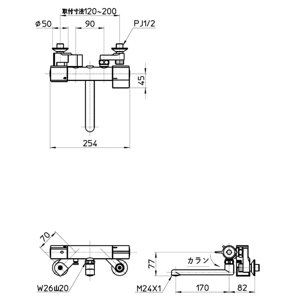 パイプの長さは170mmです。取付寸法:120~200