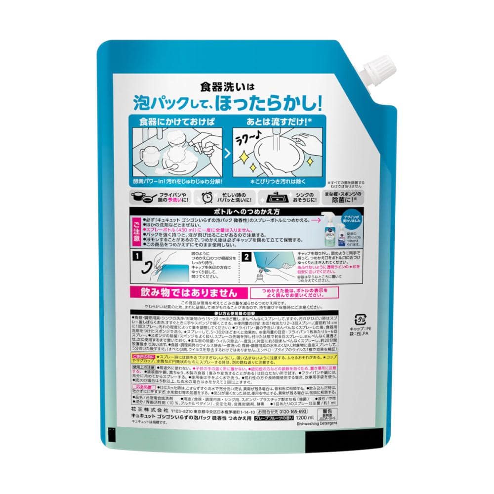 使用上の注意:<ボトルへのつめかえ方> ●必ず「キュキュット ゴシゴシいらずの泡パック 微香性」のスプレーボトルにつめかえる。 ●ほかの洗剤などとまぜない。 ●スプレーボトル(430ml)に一度に全量は入りません。 ●パックを強く持つと、液が飛び出ることがあるので注意する。 ●液モレすることがあるので、つめかえ後は必ずキャップを閉めて立てて保管する。 ●この商品をつめかえずにそのまま使用しない。 <ご使用の前に> ●スプレー時には顔を近づけすぎないようにし、吸い込まないように注意する。ムセるおそれがある。 ●コップやマグカップ、水筒など円筒状のものにスプレーする時は、泡の跳ね返りに注意する。 <使用上の注意> ●用途外に使わない。 ●子供の手の届く所に置かない。 ●認知症の方などの誤飲を防ぐため、置き場所に注意する。 ●塗装面や銅、真ちゅう、木製の食器(傷みや変色することがある)は目立たない所で試す。 ●フライパンや鍋には、充分に冷めてからスプレーする。 ●使用後は手をよく水で洗う。 ●荒れ性の方や長時間使用する場合、炊事用手袋を使う。 ●流水の場合は5秒以上、ため水の場合は水をかえて2回以上すすぐ。