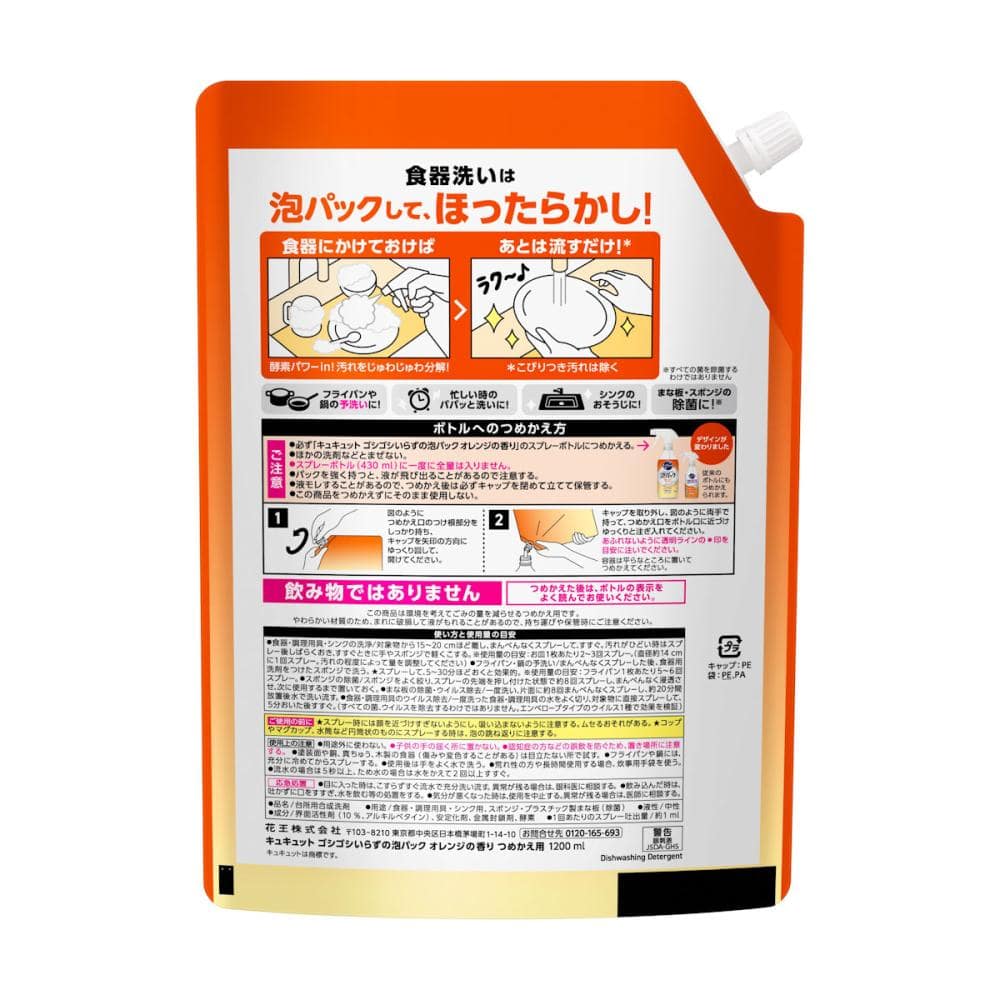使用上の注意:<ボトルへのつめかえ方> ●必ず「キュキュット ゴシゴシいらずの泡パック オレンジの香り」のスプレーボトルにつめかえる。 ●ほかの洗剤などとまぜない。 ●スプレーボトル(430ml)に一度に全量は入りません。 ●パックを強く持つと、液が飛び出ることがあるので注意する。 ●液モレすることがあるので、つめかえ後は必ずキャップを閉めて立てて保管する。 ●この商品をつめかえずにそのまま使用しない。 <ご使用の前に> ●スプレー時には顔を近づけすぎないようにし、吸い込まないように注意する。ムセるおそれがある。 ●コップやマグカップ、水筒など円筒状のものにスプレーする時は、泡の跳ね返りに注意する。 <使用上の注意> ●用途外に使わない。 ●子供の手の届く所に置かない。 ●認知症の方などの誤飲を防ぐため、置き場所に注意する。 ●塗装面や銅、真ちゅう、木製の食器(傷みや変色することがある)は目立たない所で試す。 ●フライパンや鍋には、充分に冷めてからスプレーする。 ●使用後は手をよく水で洗う。 ●荒れ性の方や長時間使用する場合、炊事用手袋を使う。 ●流水の場合は5秒以上、ため水の場合は水をかえて2回以上すすぐ。