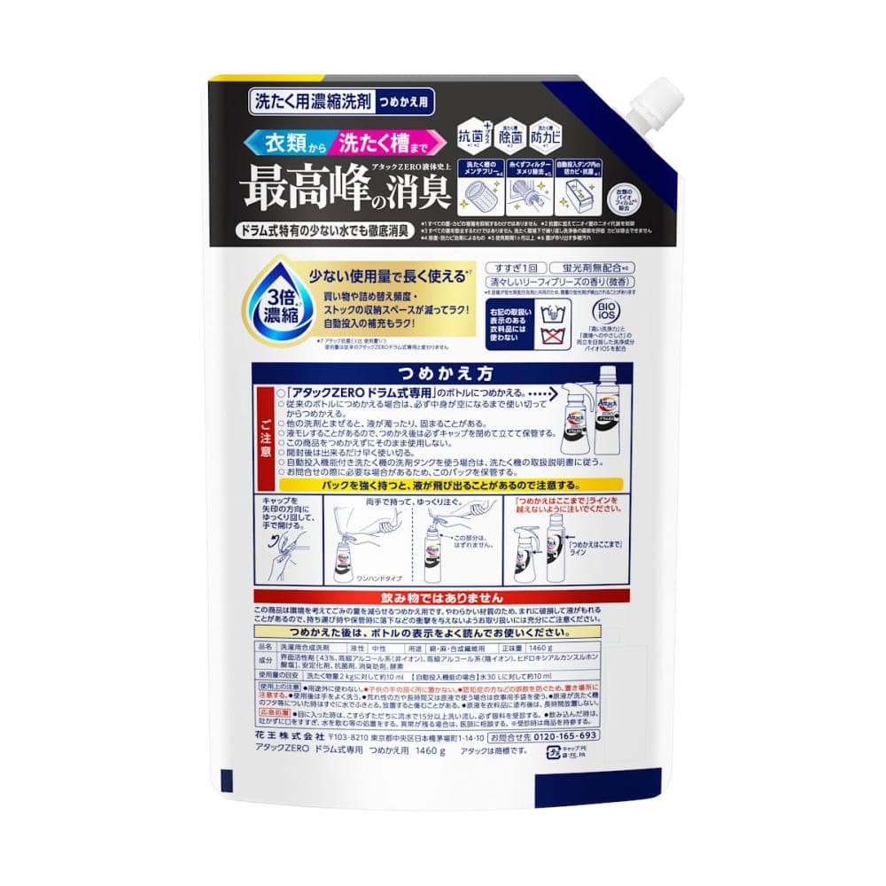 使用上の注意:つめかえ方 ご注意 ○「アタックZERO ドラム式専用」のボトルにつめかえる。 ○ 従来のボトルにつめかえる場合は、必ず中身が空になるまで使い切ってからつめかえる。 ○ 他の洗剤とまぜると、液が濁ったり、固まることがある。 ○ 液モレすることがあるので、つめかえ後は必ずキャップを閉めて立てて保管する。 ○ この商品をつめかえずにそのまま使用しない。 ○ 開封後は出来るだけ早く使い切る。 ○ 自動投入機能付き洗たく機の洗剤タンクを使う場合は、洗たく機の取扱説明書に従う。 ○ お問合せの際に必要な場合があるため、このパックを保管する。 パックを強く持つと、液が飛び出ることがあるので注意する。 使用上の注意 ●用途外に使わない。 ●子供の手の届く所に置かない。 ●認知症の方などの誤飲を防ぐため、置き場所に注意する。 ●使用後は手をよく洗う。 ●荒れ性の方や長時間又は原液で使う場合は炊事用手袋を使う。 ●原液が洗たく機のフタ等についた時はすぐに水でふきとる。放置すると傷むことがある。 ●原液を衣料品に塗布後は、長時間放置しない。