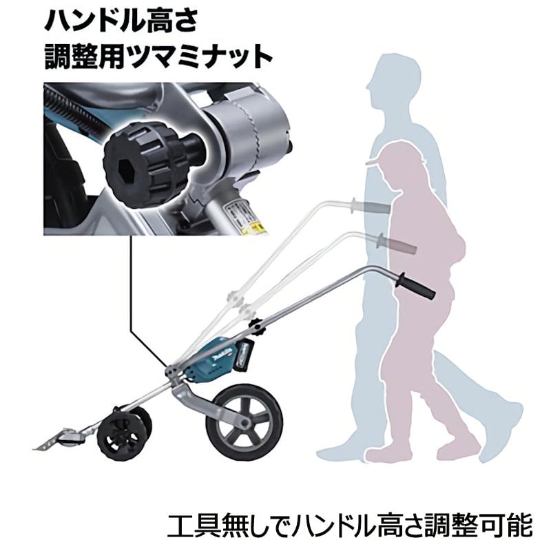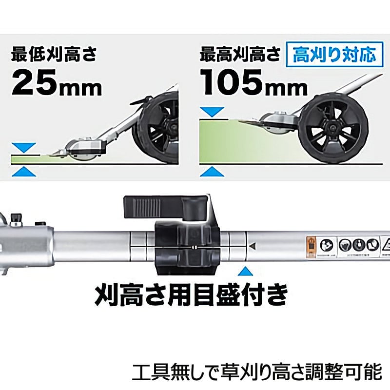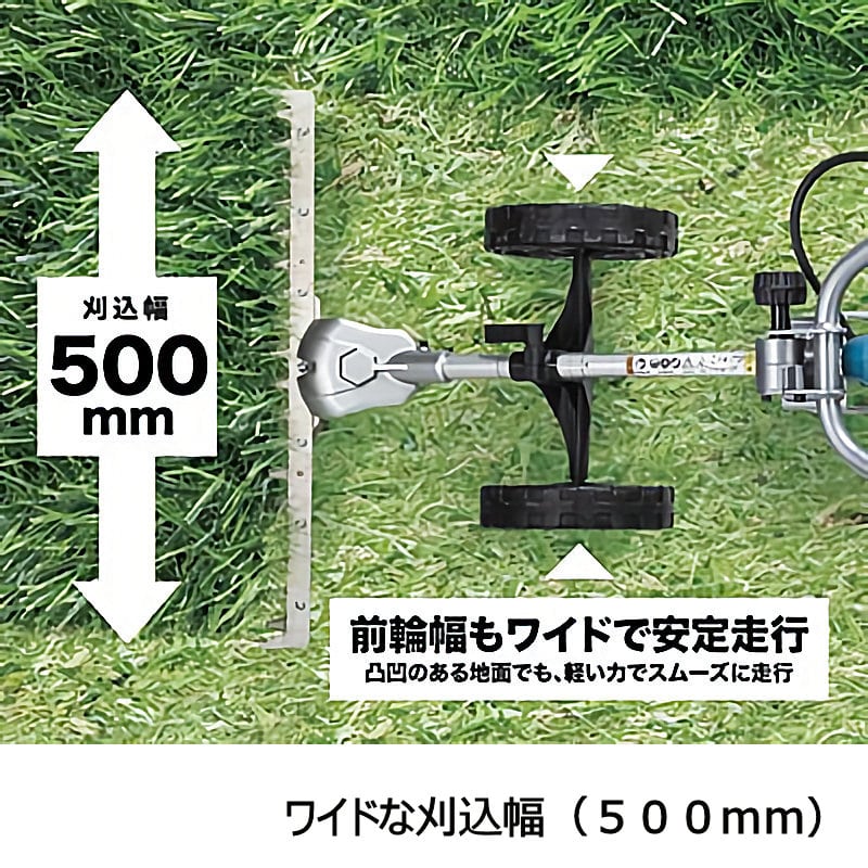 【商品サイズ】 ●長さ(mm) (使用時):1,155〜1,345 (ハンドル折り畳み時):898(横置き)/599(縦置き) ●幅(mm) (使用時):521 (ハンドル折り畳み時):534 ●高さ(mm) (使用時):791〜1,020 (ハンドル折り畳み時):471(横置き)/905(縦置き) ●刈込幅:500mm ●刈高調整:25~105mm ●ストローク数[往復/分]:高速2000、低速1500 ●カット数[回/分]:高速4000、低速3000 ●防じん・防水保護等級:IPX4