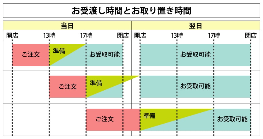 - ご注文日やお受取日がご指定店舗の休業日の場合、お受取は翌営業日以降となります。