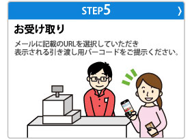 - .指定された店舗にご来店いただき、サービスカウンターにて引き渡し用バーコードが記載されている画面 をご提示ください。(引き渡し用バーコードが記載されている画面を印刷した用紙でも可能です。)