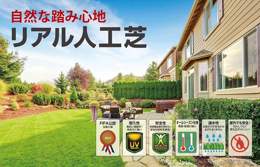 芝の長さ2cm。耐久性、安全性、通水性に優れたリアル人工芝。寒さに強く、丈夫で長持ち。紫外線に強く色あせしにくい。十字型直毛パイルで直立しやすく、4色パイルで自然な仕上がり。